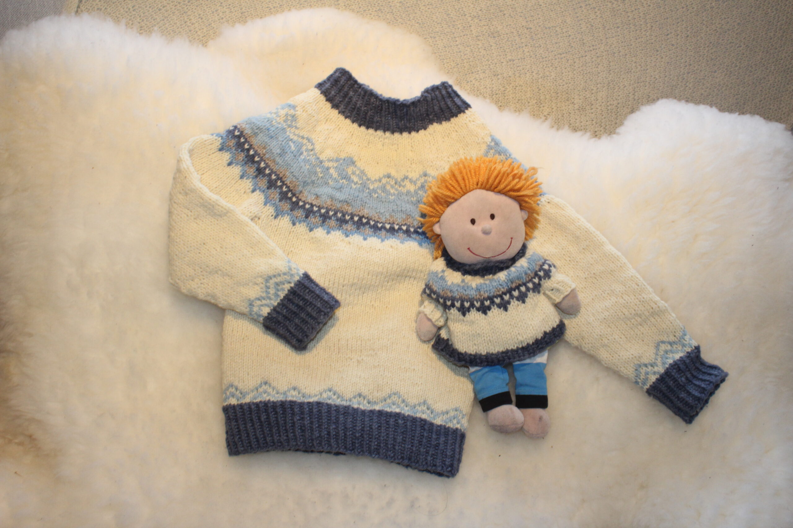 OBS: Genseren på bildet har blå kanter (bol, ermer, hals). STRIKKEPAKKEN TILSVARER EN GENSER MED HVITE KANTER.