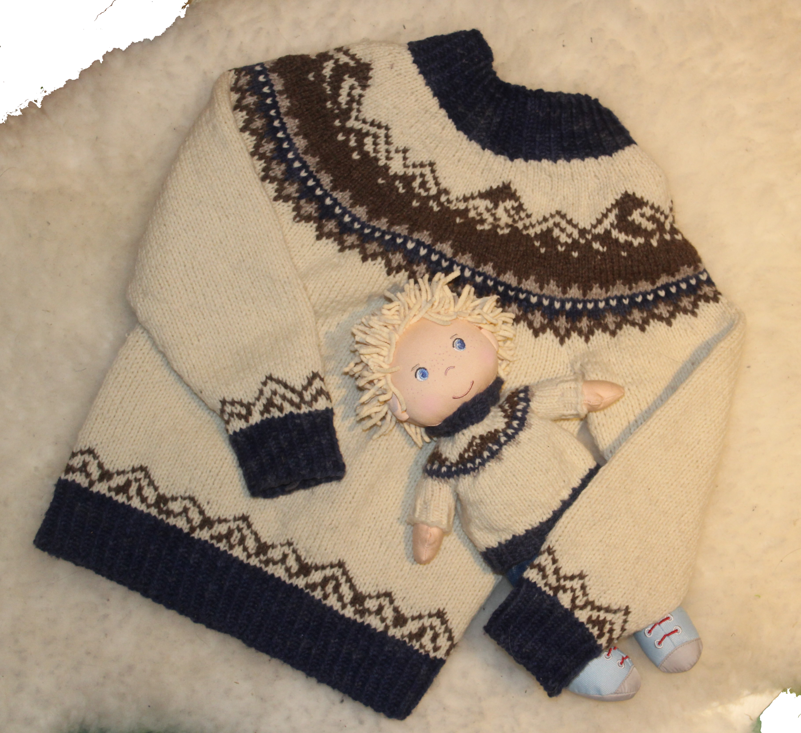 Det er brukt lebrasa 3 tråds, og hånd farget lebrasa 3 tråds, FADO 663 og FADO 661. Oppskrifter for barn og voksne er 2 forskjellige.